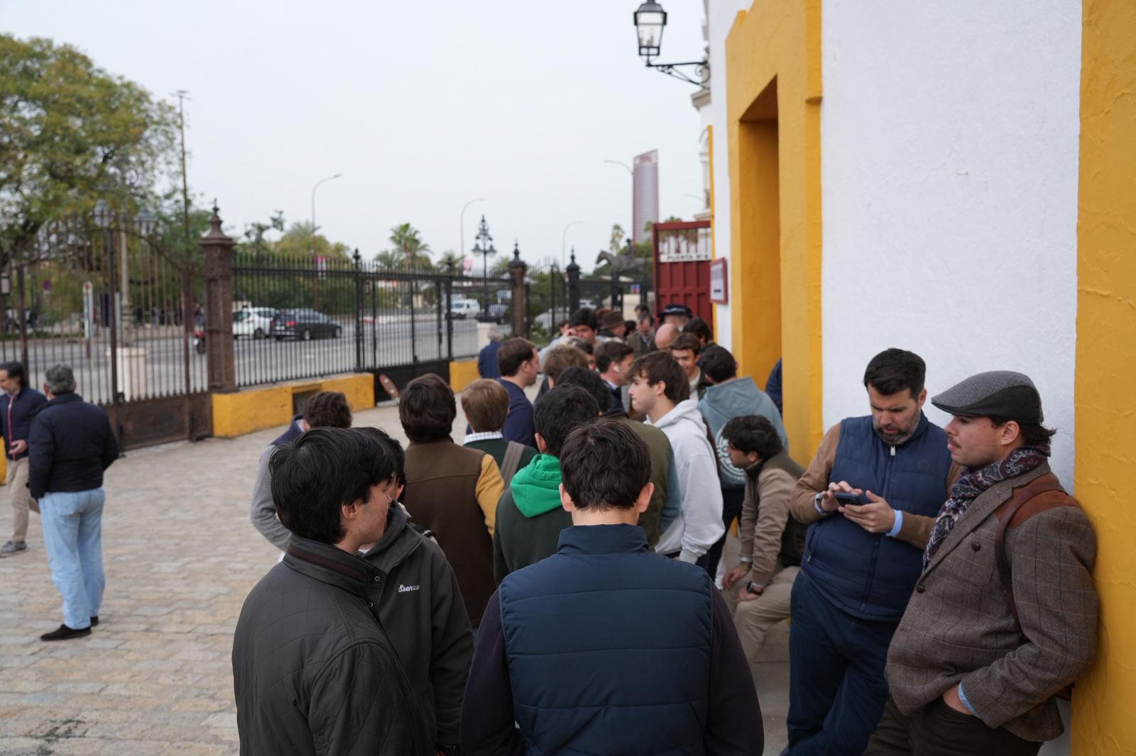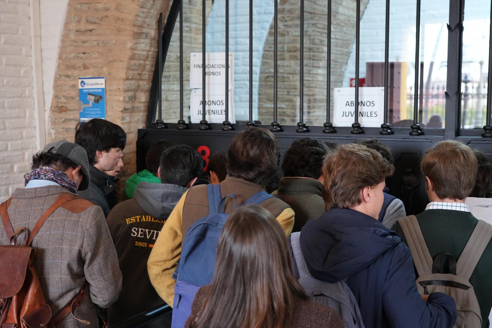 Numerosos aficionados hacen cola desde primera hora de la mañana, dispuestos a conseguir el abono que les dará derecho a presenciar 25 festejos en la Maestranza sevillana.